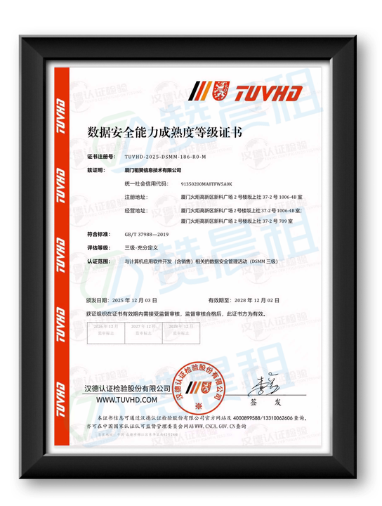 在数字化浪潮席卷租赁行业的当下,数据安全已成为企业数字化转型的核心命脉。近日,国内租赁技术服务领域传来重磅喜讯:赞晨租(厦门租赞信息技术有限公司)顺利通过国际知名第三方机构 TUV 汉德的全方位严苛评估,成功斩获数据安全能力成熟度(DSMM)等级证书。这一认证不仅标志着赞晨租的数据安全管理体系已达到流程标准化、管控体系化的行业先进水平,更彰显了其以硬核技术为租赁生态筑牢数据安全屏障的强劲实力。