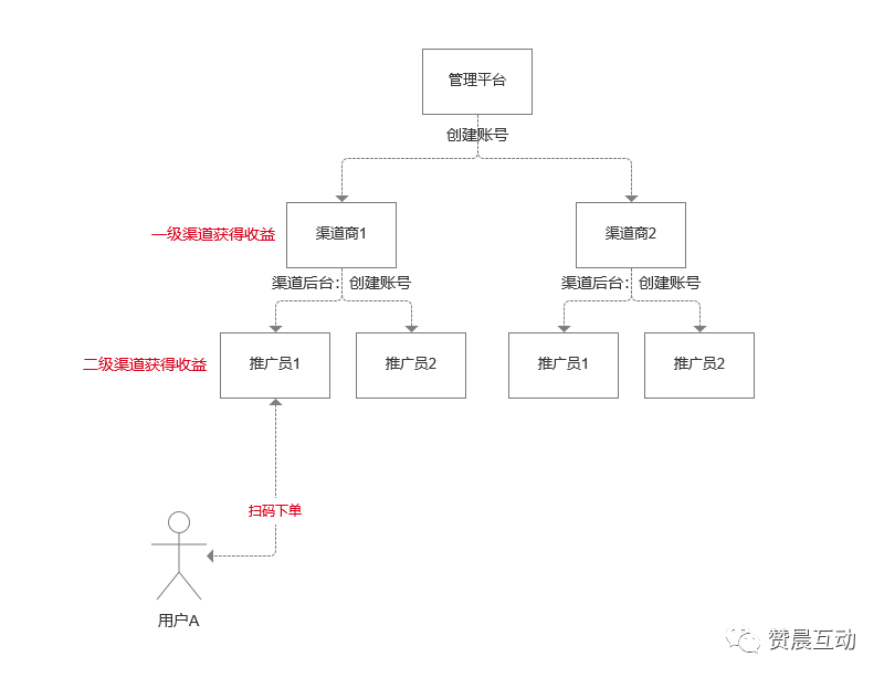 平台、商户可分别创建⾃⼰下级渠道商,两者的下级渠道商相互独⽴,没有层级关系。可通过系统后台,进行商品推广和销售。