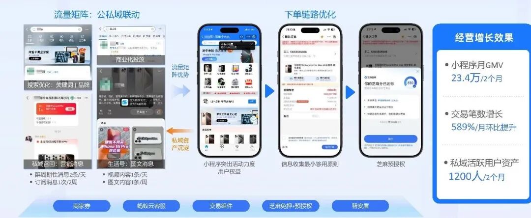 一套“组合拳”打通商家全链路发展支付宝针对消费品租赁行业打造的全链路产品矩阵,从前端获客到后端运营,为商家构建了完整的业务支撑体系。